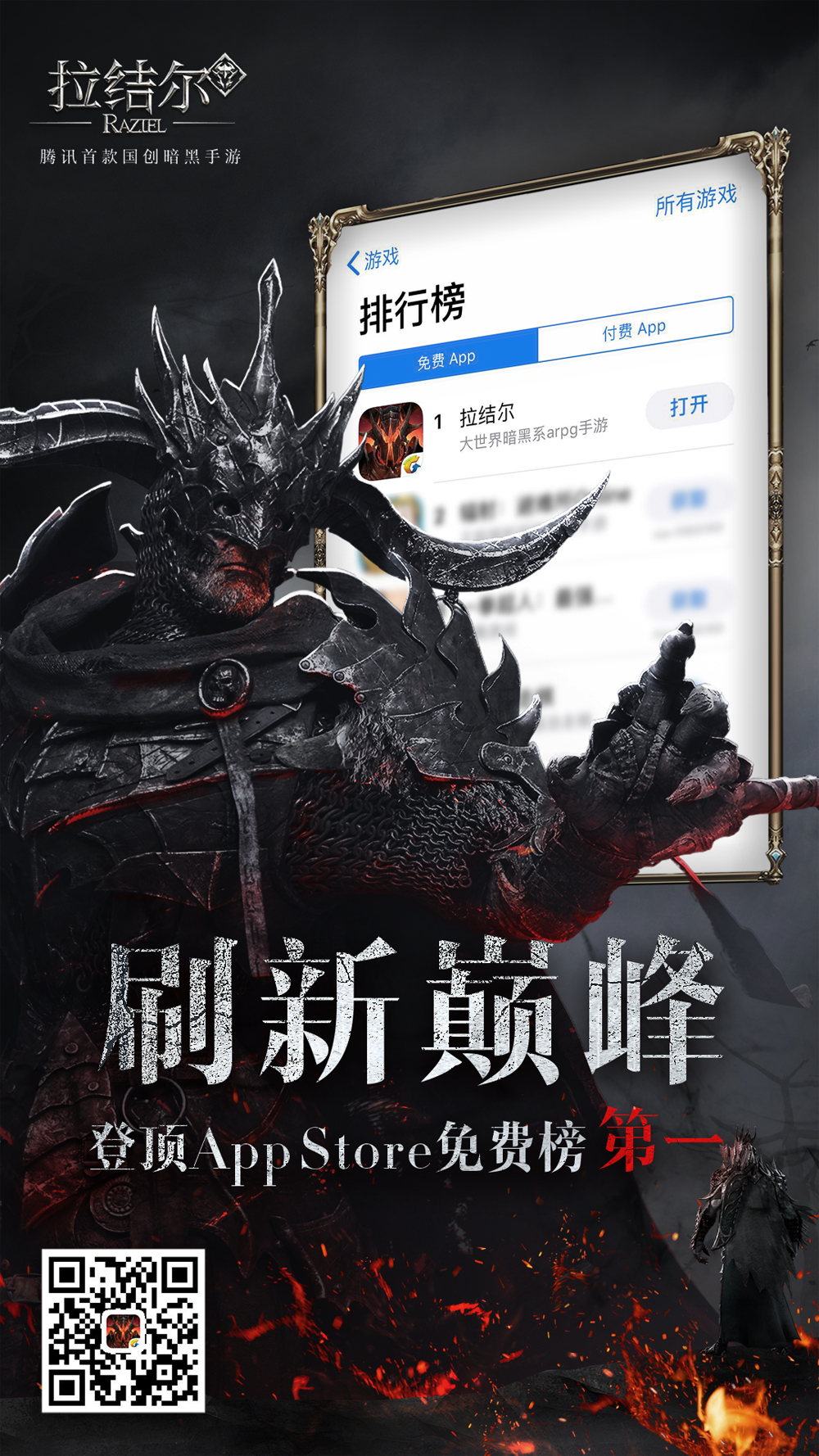 在暗黑粉们的火热支持下,预约用户再加上闻讯而来的新人玩家不断加入,暗黑大军的队伍也是越发壮大,并仅用1天就将《拉结尔》推至了App Store免费App排行榜的第一位!