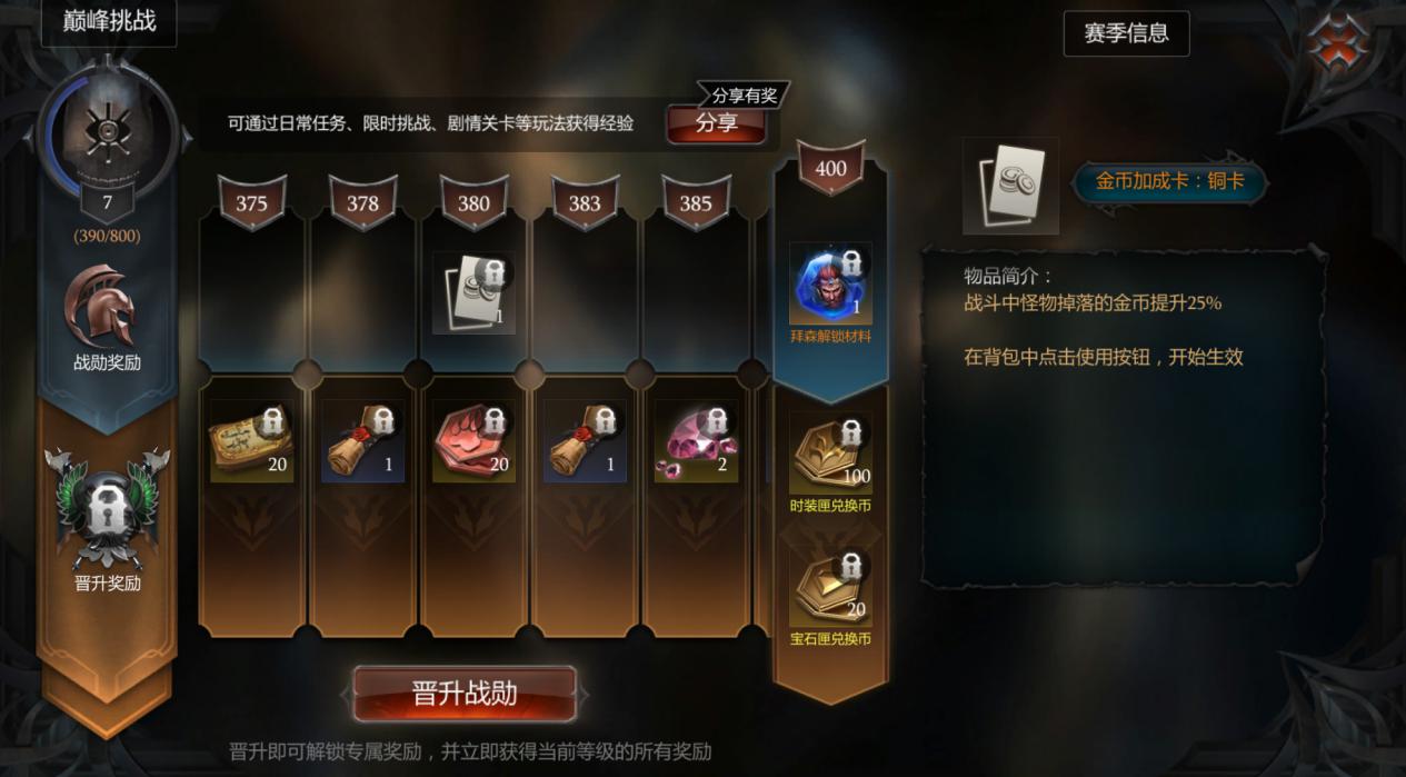 代替原有角色等级的是赛季巅峰等级,冒险者通过主线剧情、每日任务等各种活动获得巅峰经验,用以在巅峰战勋活动中提升巅峰等级,巅峰等级累计有